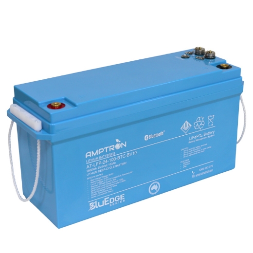 • 24 VOLT 100AH / 200A BMS / 2560WH CAPACITY AMPTRON BLUEDGE LIFEPO4 ABS BATTERY WITH BLUETOOTH & DATA COMMS - IP67 RATING