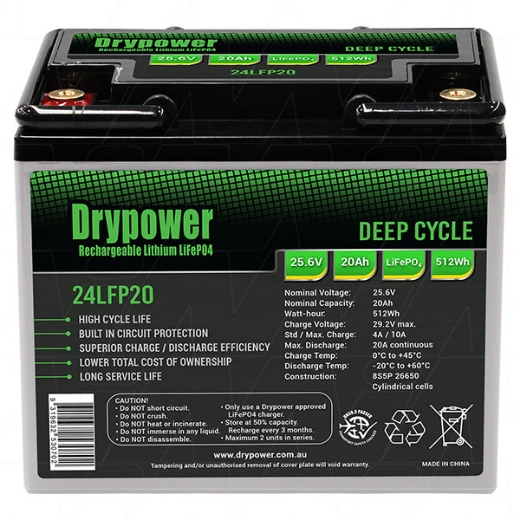 • 25.6 VOLT 20AH / 20A BMS / 512WH CAPACITY DRYPOWER LIFEPO4 BATTERY - IP65 RATING