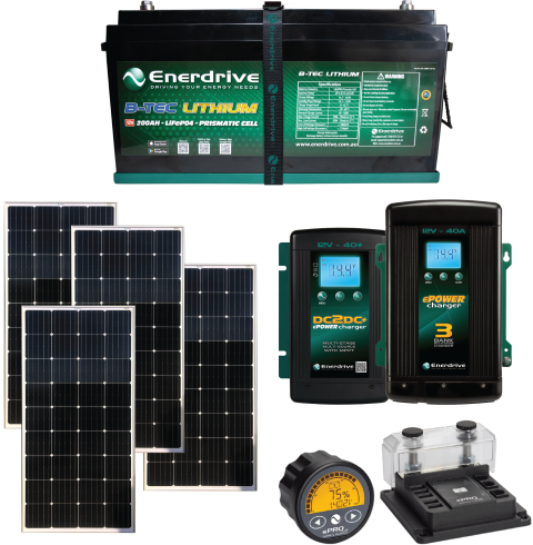ENERDRIVE 12V 200AH B-TEC LIFEPO4 BATTERY INC 760W SOLAR, 12V 40AH DC-DC CHARGER, 12V 40AH AC CHARGER & EPRO+ MONITOR BUNDLE