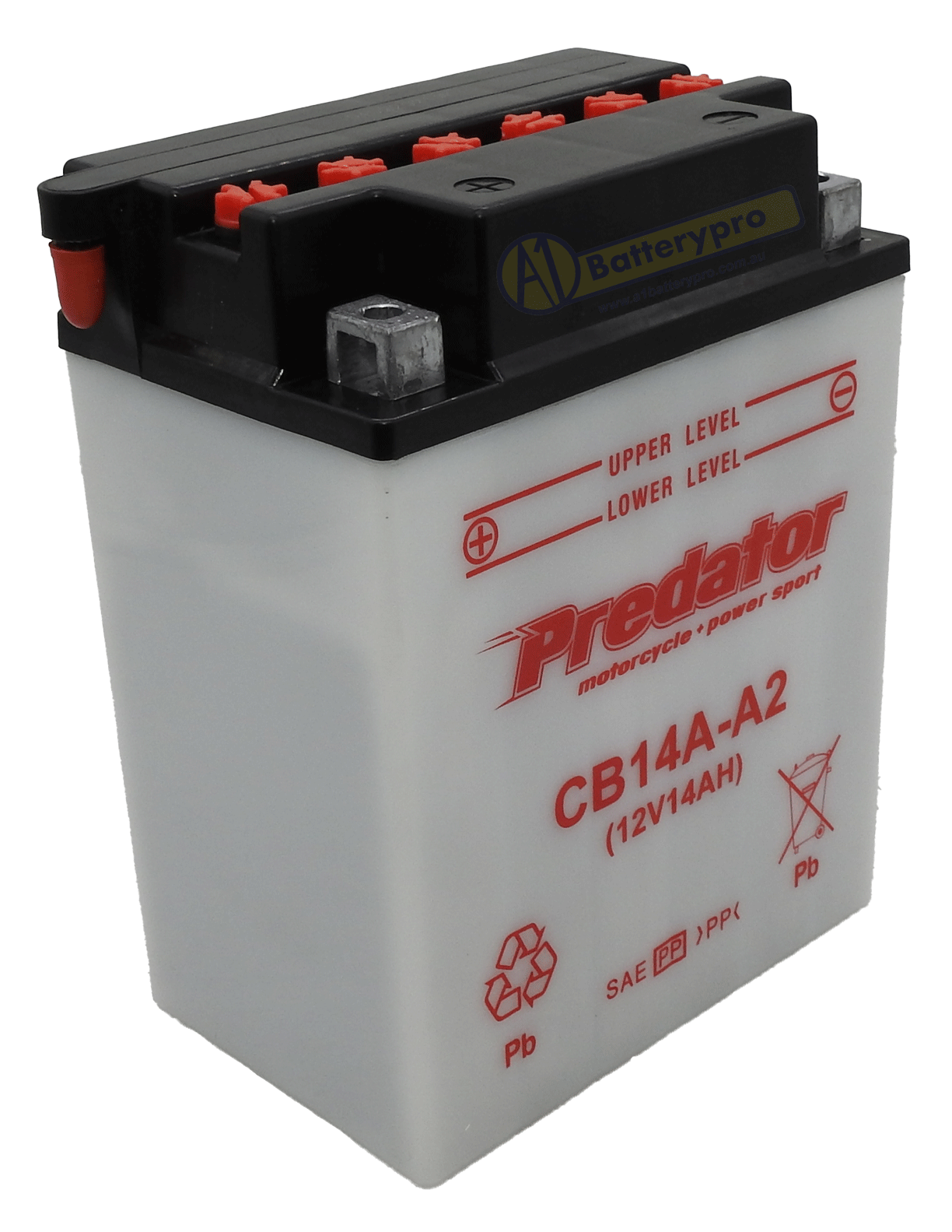 The Predator CB14A-A conventional flooded battery is designed to meet many original OEM specifications for starting and amp hour capacities. Heavy duty glass mat/PE composite separators improve vibration resistance and through-the-wall (TTP) intercell connectors minimise internal resistance for maximum power. Quick remove vent caps and transparent casing make checking electrolyte levels easy and no fuss.