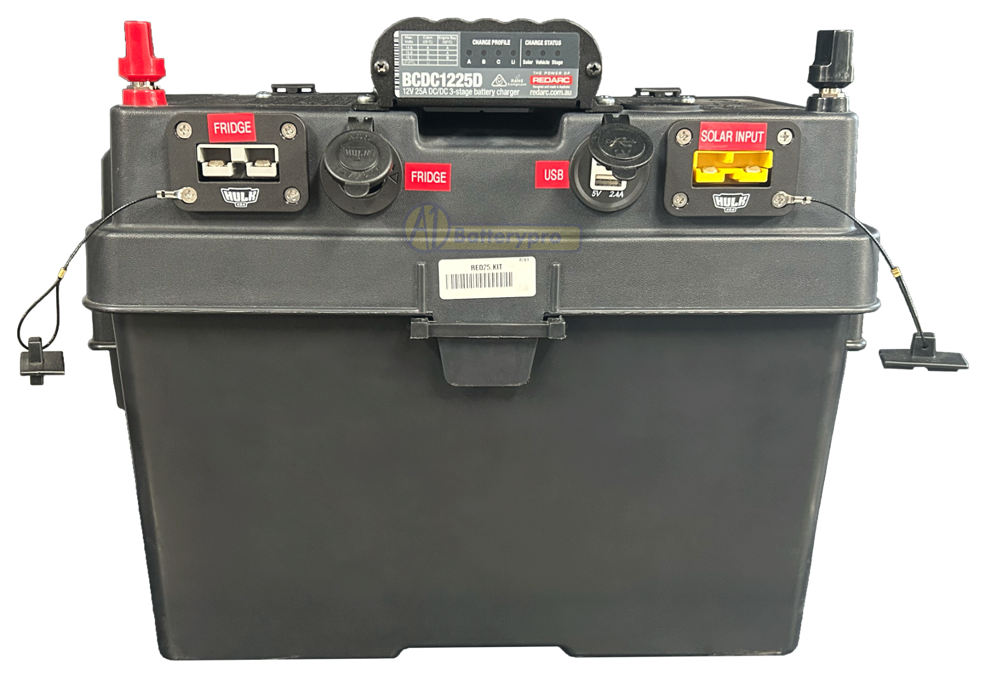 PREMADE BATTERY BOX, INCLUDES 25 AMP REDARC DC-DC CHARGER, 126AH LITHIUM BATTERY & ACCESSORY SOCKETS