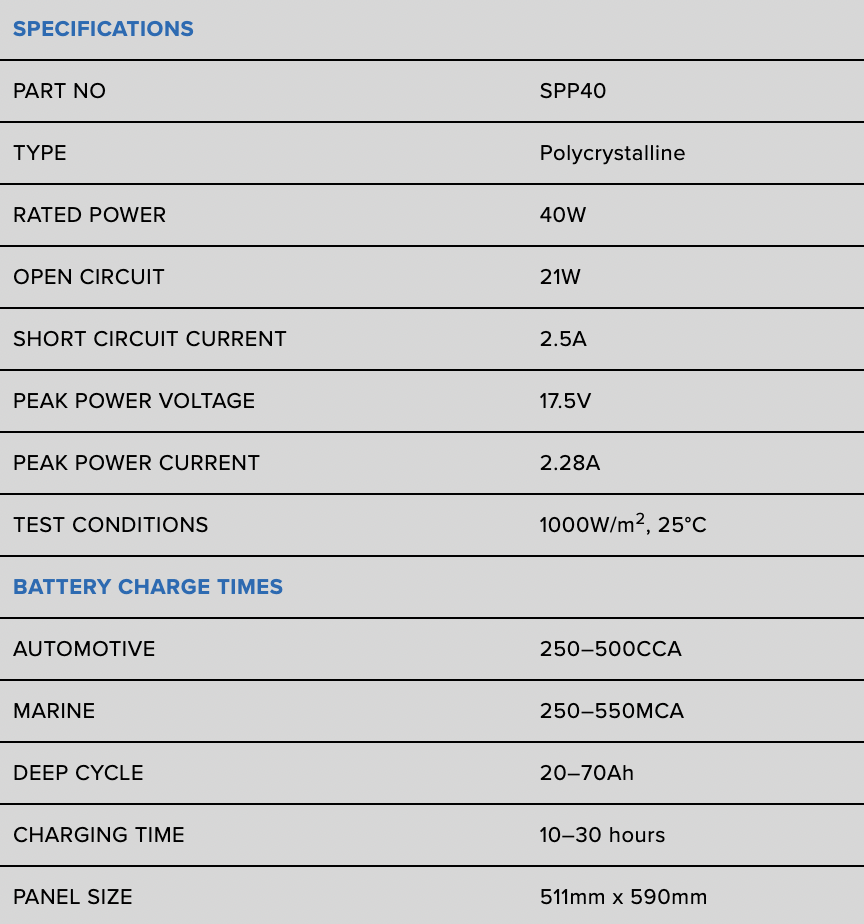 ____________________________ The ideal panel size to charge and maintain infrequently used batteries where 240V power is not easily accessible. -Sealed Junction Box - Protects against external elements and includes connection terminals; -Tempered Low Iron Glass - Provides better impact resistance and improved light transmission; -Heavy Duty Frame - Superior strength and durability;